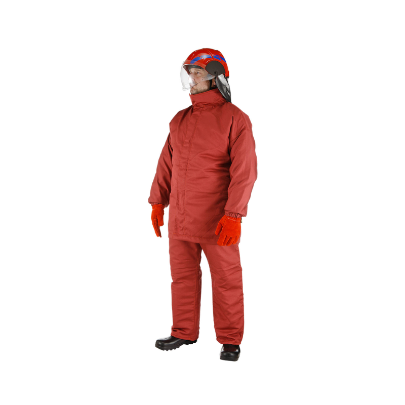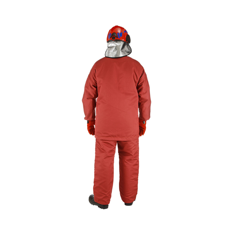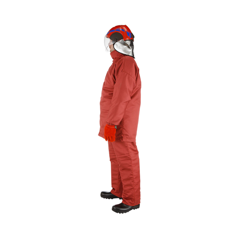 Complete two-piece fire-resistant suit with four-layer construction, aramid outer shell and breathable waterproof membrane. Reinforced sealed seams, protected front closure and adjustable braces.
