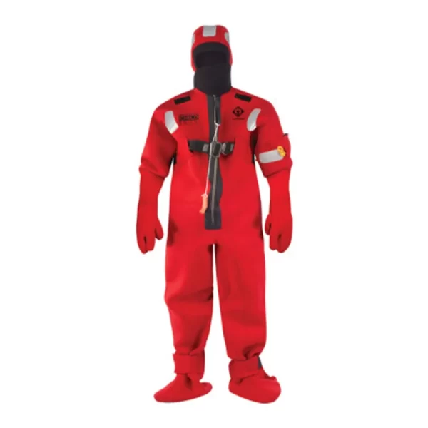 The Crewsaver Child Immersion Suit is a SOLAS-approved thermal protection suit specifically designed to safeguard children during vessel abandonment or emergency evacuation situations.