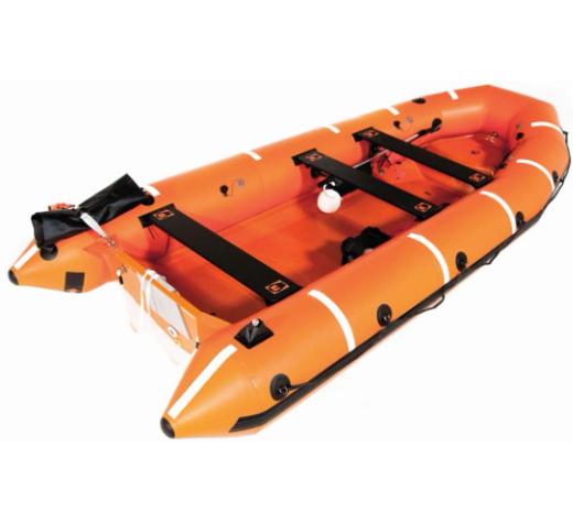 This 4.50m boat is equipped with a righting system and can be launched using a 4 point sling and approved release hook. Capacity for 6 people. Takes a 25 or 40hp SOLAS outboard engine. Fully equipped with slings and SOLAS A pack.